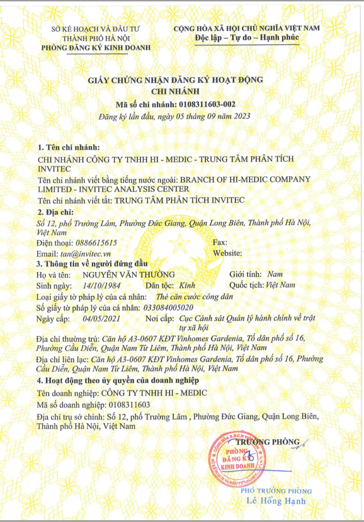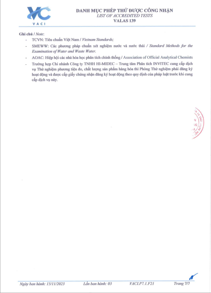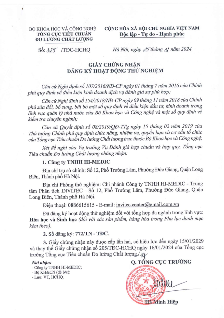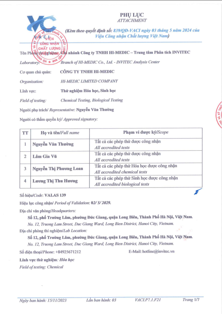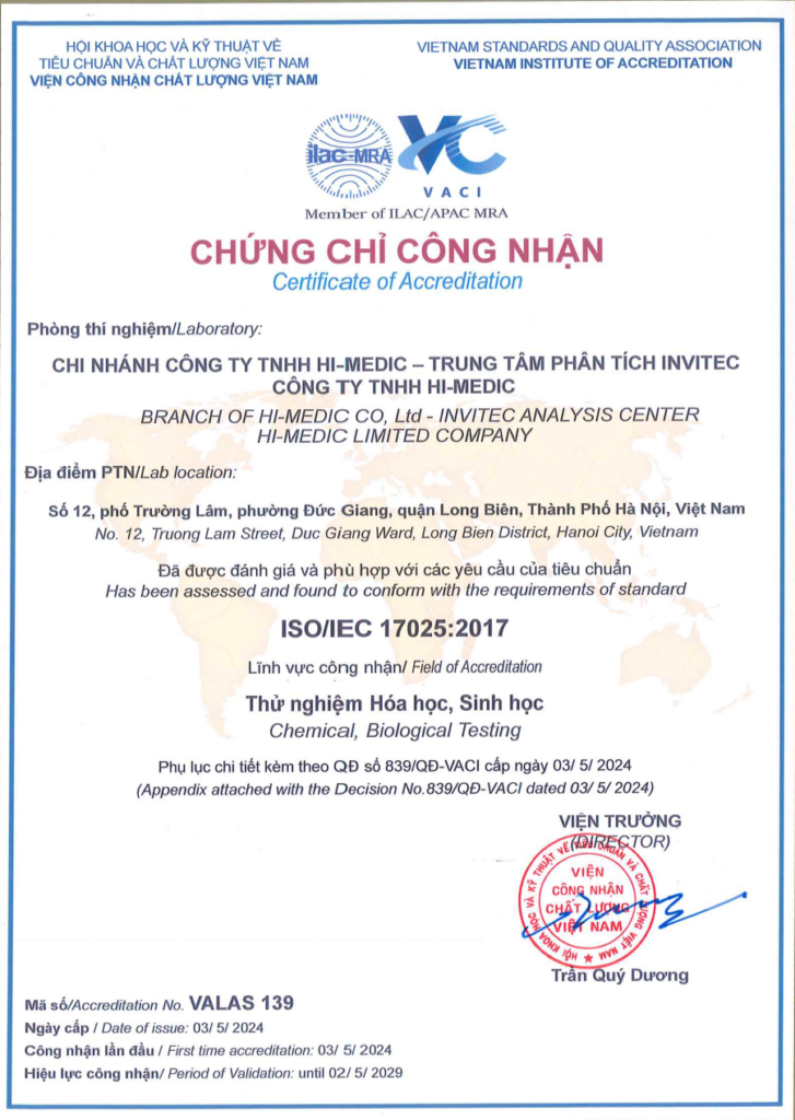 Ngày 03/05/2024, Viện công nhận chất lượng Việt Nam – VACI đã trao Chứng chỉ công nhận lĩnh vực Thử nghiệm Hoá học, Sinh học cho Chi nhánh Công ty TNHH Hi-Medic – Trung tâm phân tích Invitec kèm theo quyết định số 839/QĐ-VACI với mã số VALAS 139.